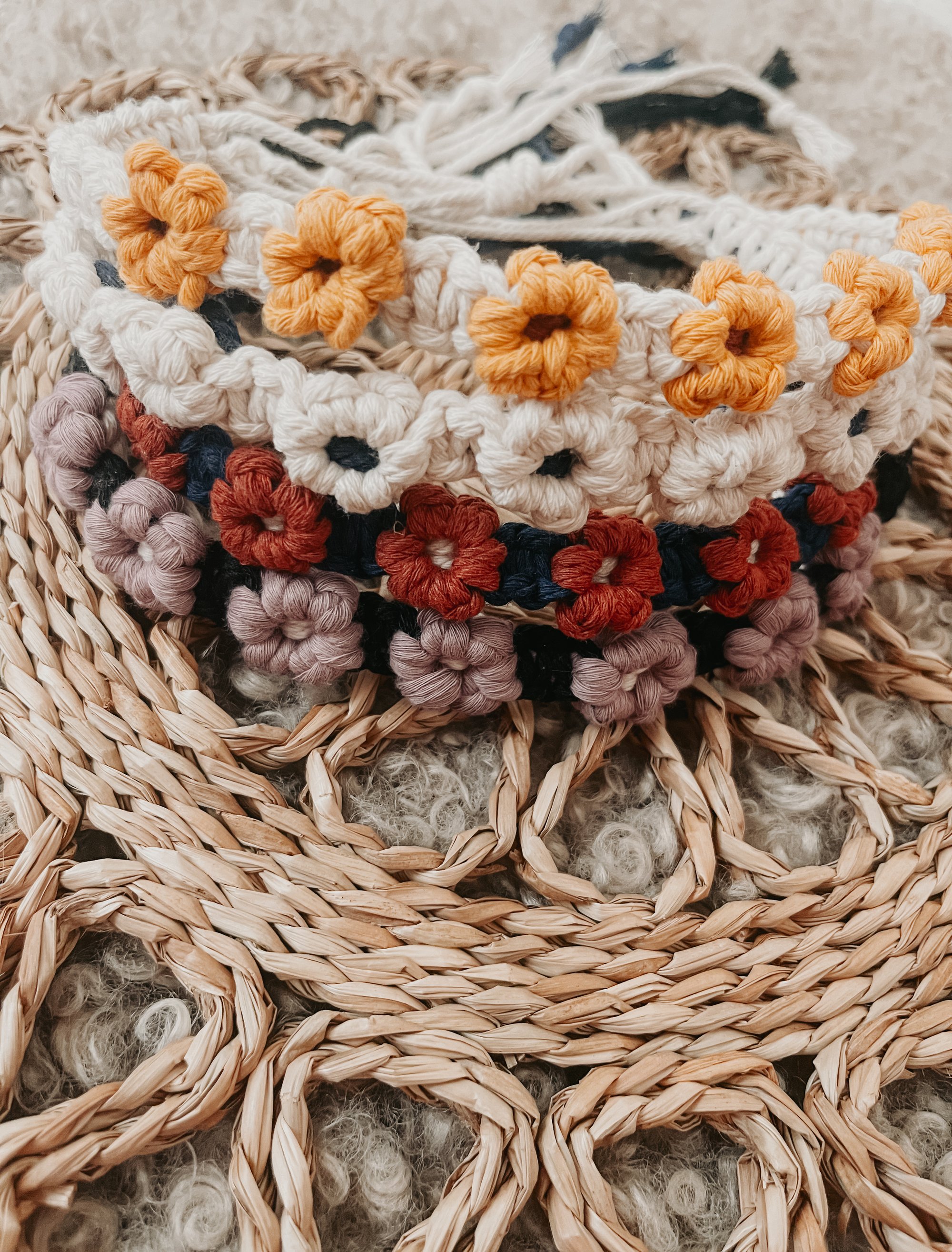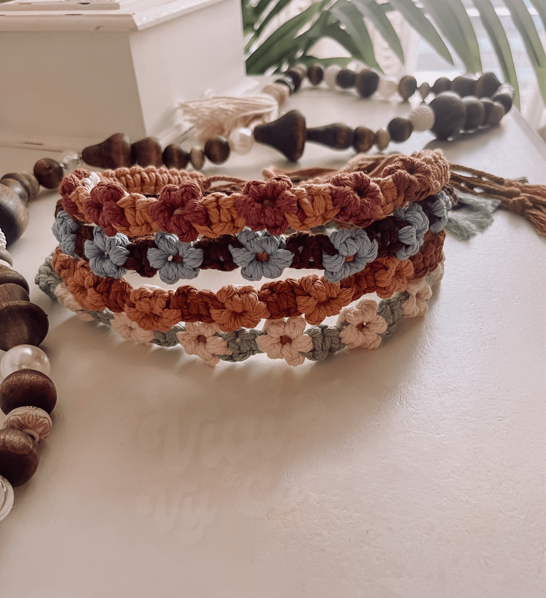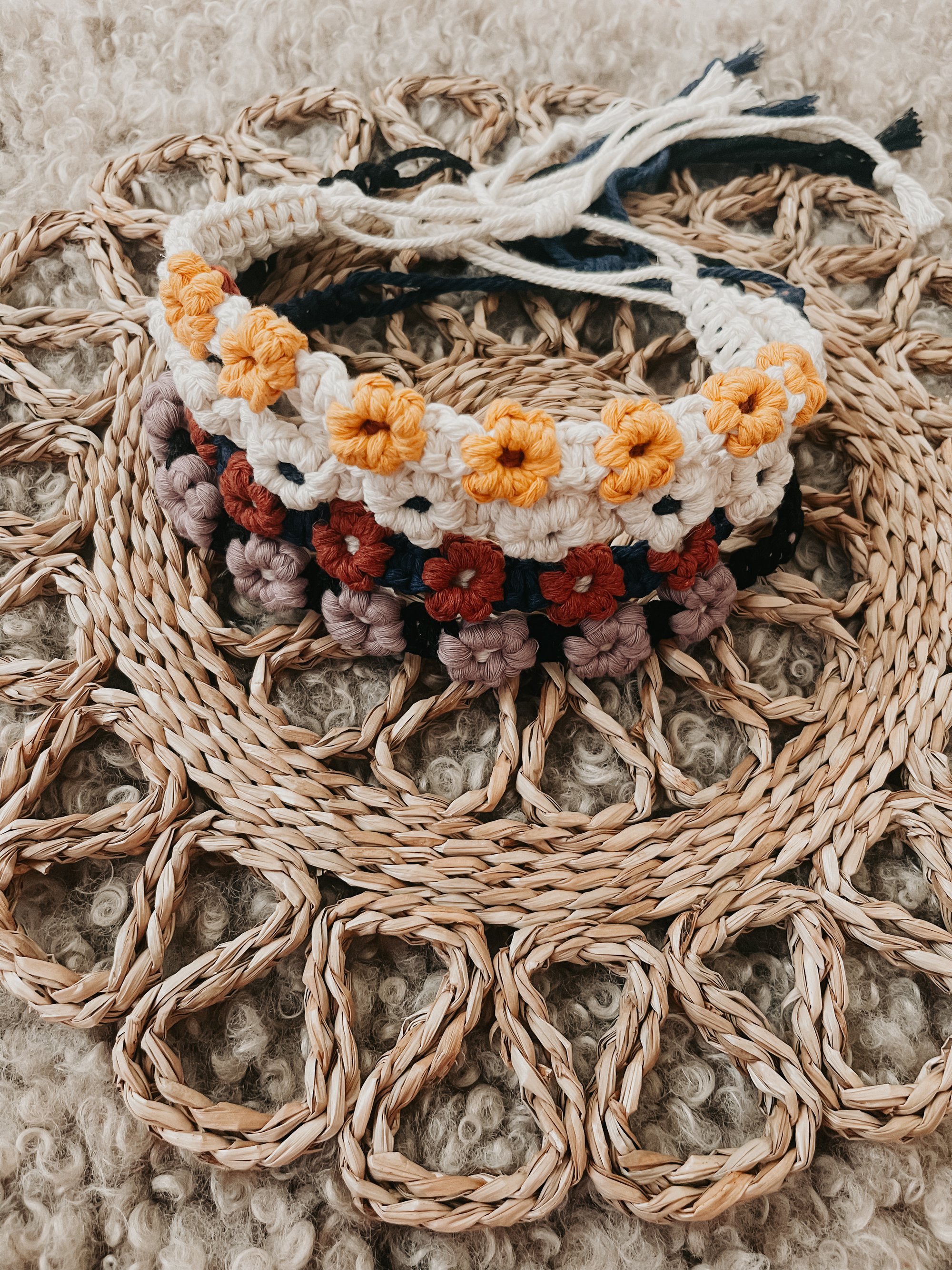 Macrame Flower Crown- Size Adult. 7 flowers included on your choice of color band. Choose colors for flowers and center of flowers(stigma). See color chart.